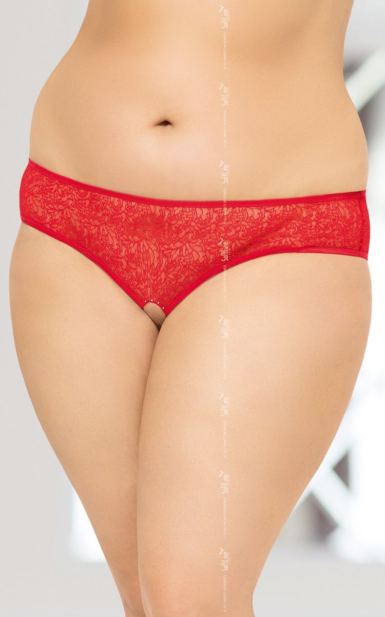 Трусики с доступом, выполненные из фактурного кружева, вырез в интимной зоне декорирован стразами.