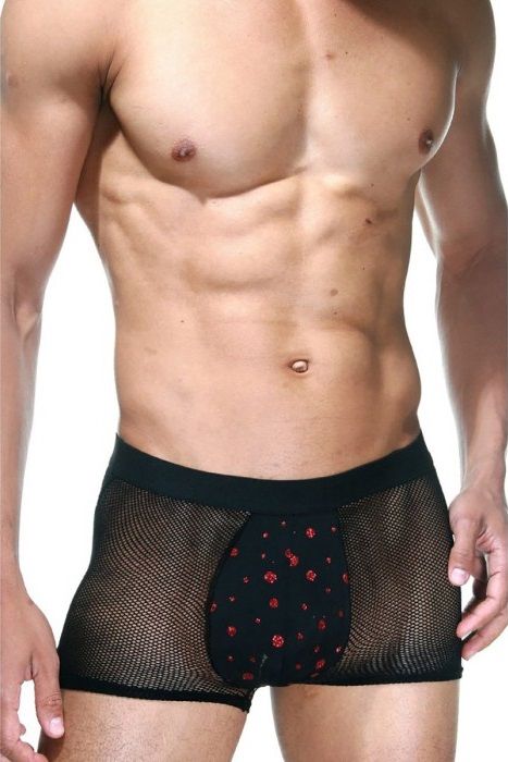 Мужские боксеры черного цвета, из тонкой хорошо тянущейся сетки. Спереди непрозрачная вставка с красными элементами.