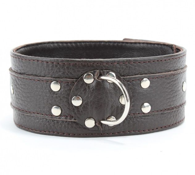 Широкий черный ошейник из мягкой кожи. Застегивается на пряжку. Впереди - скоба, к которой можно прикрепить поводок или наручники.